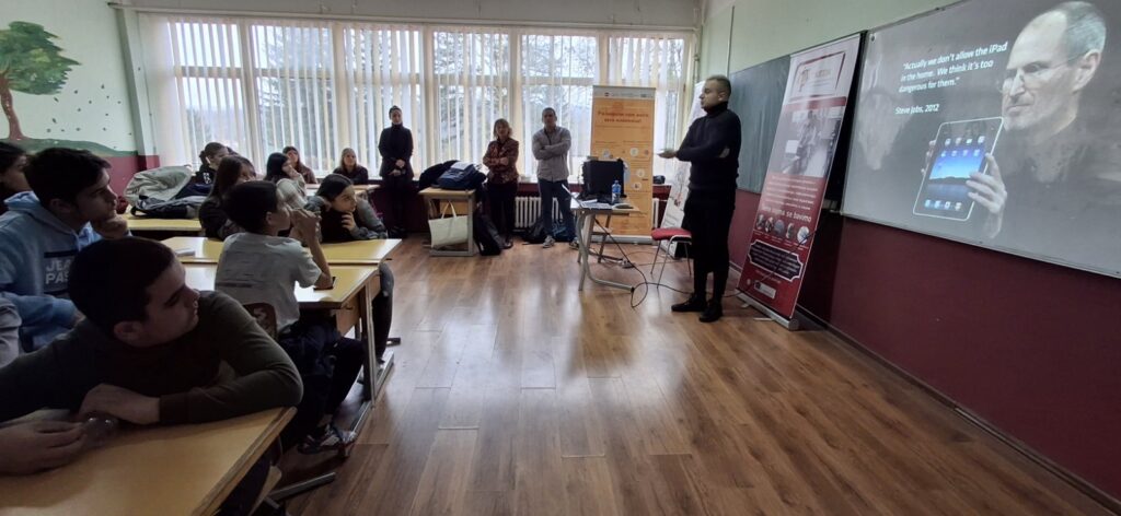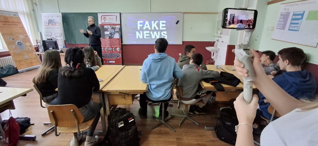 Slobodan Jotić, a teacher of Serbian language and literature at Elementary School “Sveti Sava” in Požarevac, talked to the students about the types of media and their role, as well as the importance of media literacy. A special segment was devoted to the phenomenon of fake news. Through concrete examples, students learned how to recognize manipulative content. Marko Tadić, an expert in social networks, spoke about the large amount of information from social networks, explaining the concept of algorithm and the way in which the content we consume affects our thinking. In parallel with the work with the students, a training session was held for teachers, which was led by Živojin Ivković, a history teacher at the Elementary School “Kralj Aleksandar I” and the Požarevac gymnasium. Teachers were presented with practical tools and materials for processing the topic of media literacy within regular classes. In the final part of the workshop, students worked in teams. Their task was to come up with several examples of true and false news, which they later presented to the other teams. The students then analyzed the presented news and, applying the acquired knowledge, decided which were true and which were false. This part was particularly dynamic and aroused the great interest of the participants.